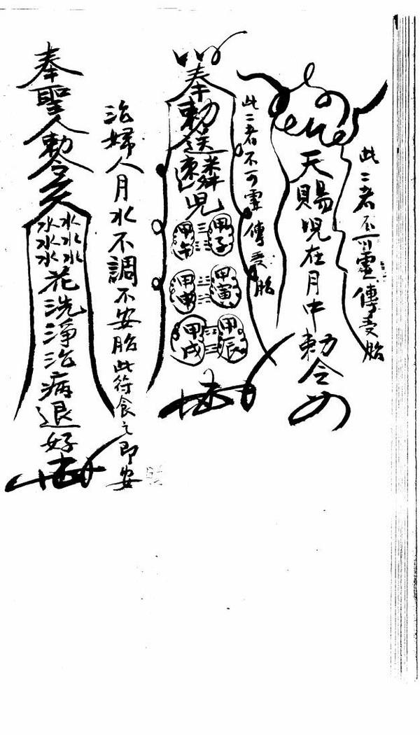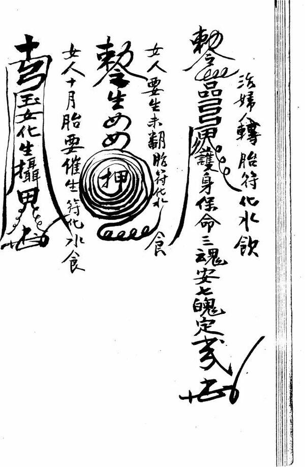 孩儿不出世化火食此带、催生符烧化泡酒食之、催神符、此二者传收胎、治妇人月水不调不安胎此符食之即安、安胎、